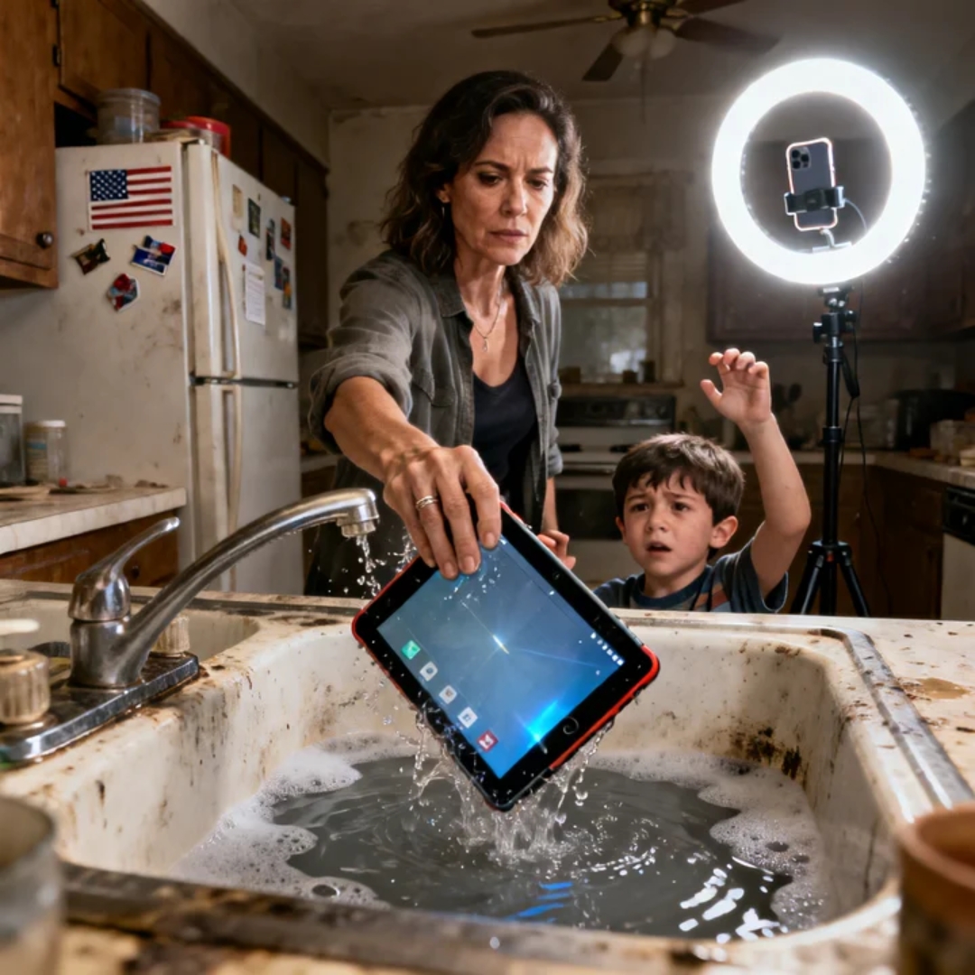 Crystal stood by the sink like she owned the room. One hand on her hip. The other holding my son’s refurbished tablet over a basin of soapy water, as casually as if she were deciding whether to rinse a plate.