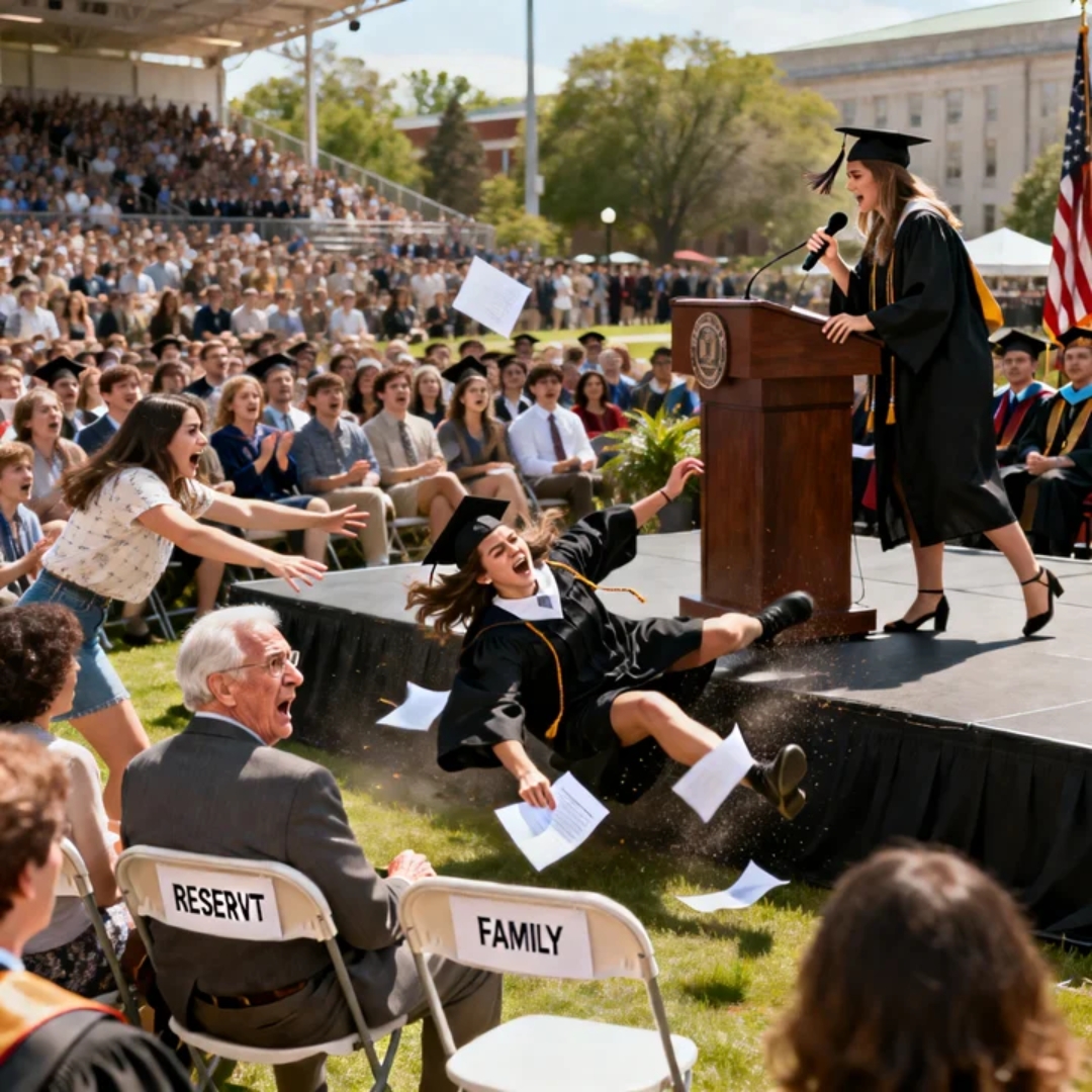 One second I was gripping the lectern—valedictorian gown, 3,000 faces, the roar of an American stadium-sized auditorium swallowing my heartbeat—and the next, the world snapped sideways, as if someone had yanked the floor out from under my life.