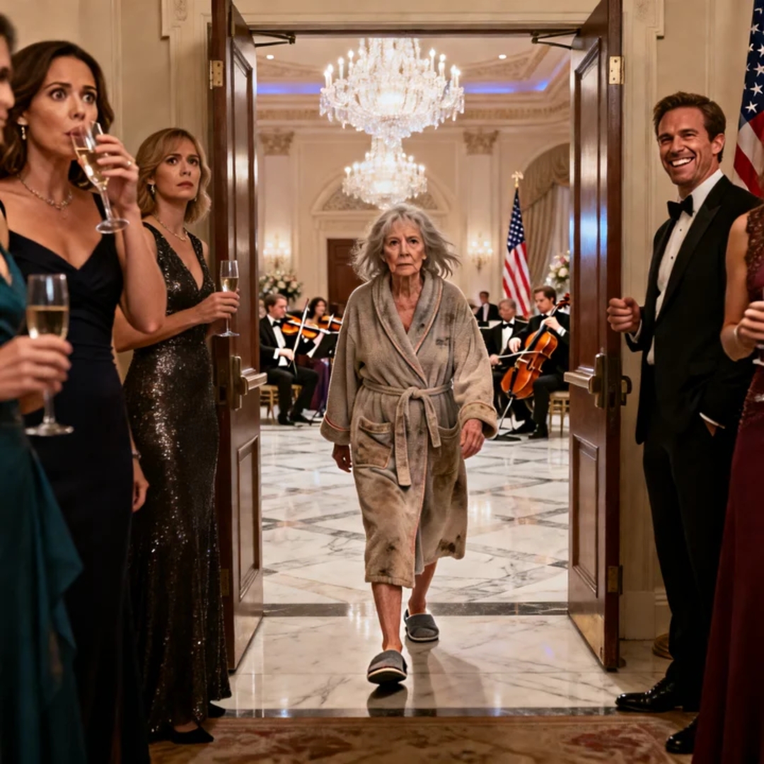 Two hundred well-dressed people turned at once, mid-laugh, mid-toast, mid-gossip—faces soft with champagne and certainty—only to see me standing there in a faded terrycloth bathrobe and house slippers, hair wild, eyes calm.