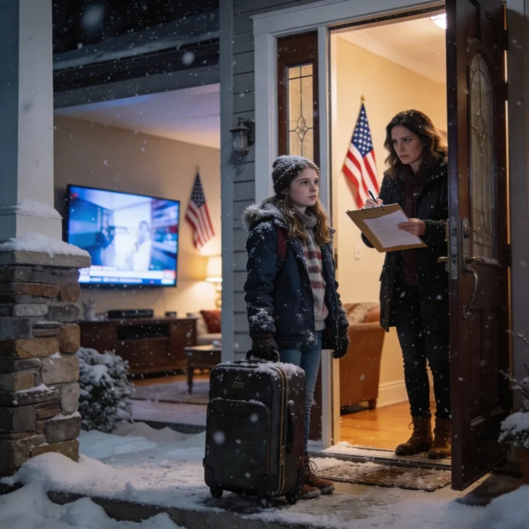 I was thirteen years old, standing on a porch in a Midwestern snowstorm with a cheap suitcase at my feet and ice creeping into the holes of my sneakers. Behind her, through the doorway, I could see the living room wall where the old television had been taken down. A pale rectangle of dust marked the spot like a target.