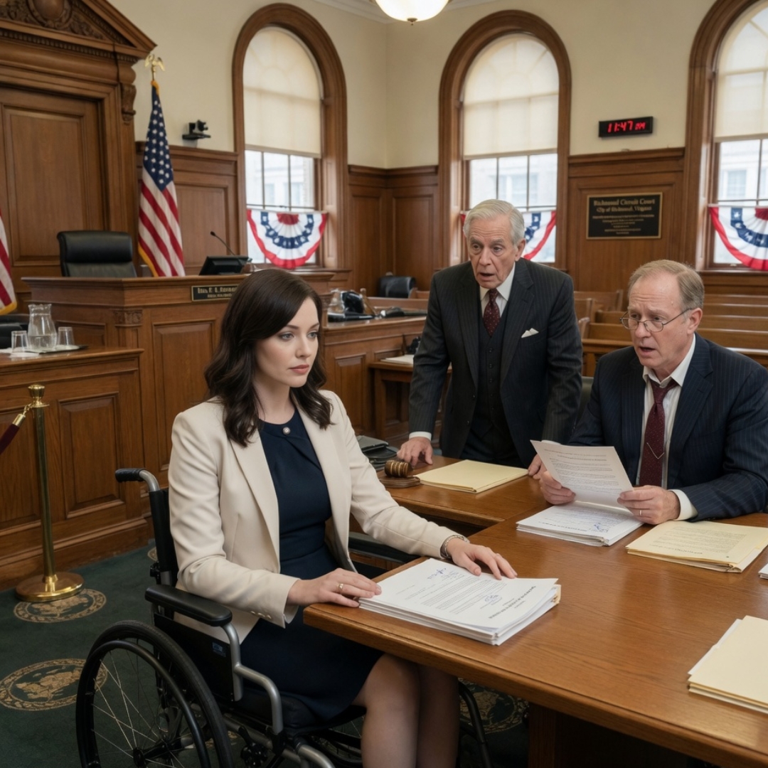 The courtroom was cold in that polished, expensive way American courtrooms often are—oak railings, brass fixtures, flags standing stiff in the corners, the seal of the Commonwealth mounted behind the bench like a promise that truth still mattered somewhere in the room. Outside, Richmond traffic kept moving under a gray Virginia sky, people hurrying past the courthouse with coffees in paper cups and phones pressed to their ears, never guessing that inside one woman was being asked to sign away the last place on earth that still felt like love.