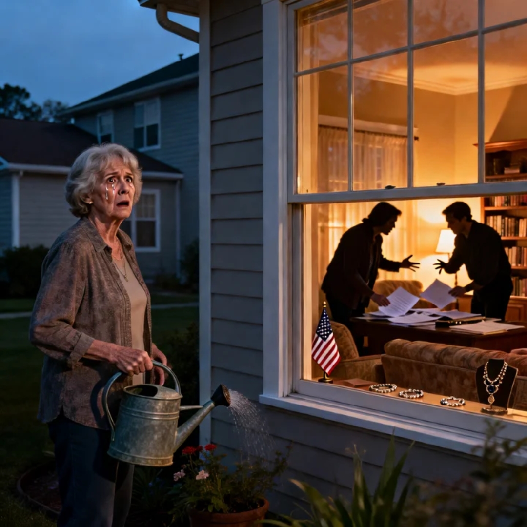 I stood outside, frozen, hose limp in my hand, while my children argued about my jewelry like vultures fighting over bone marrow.