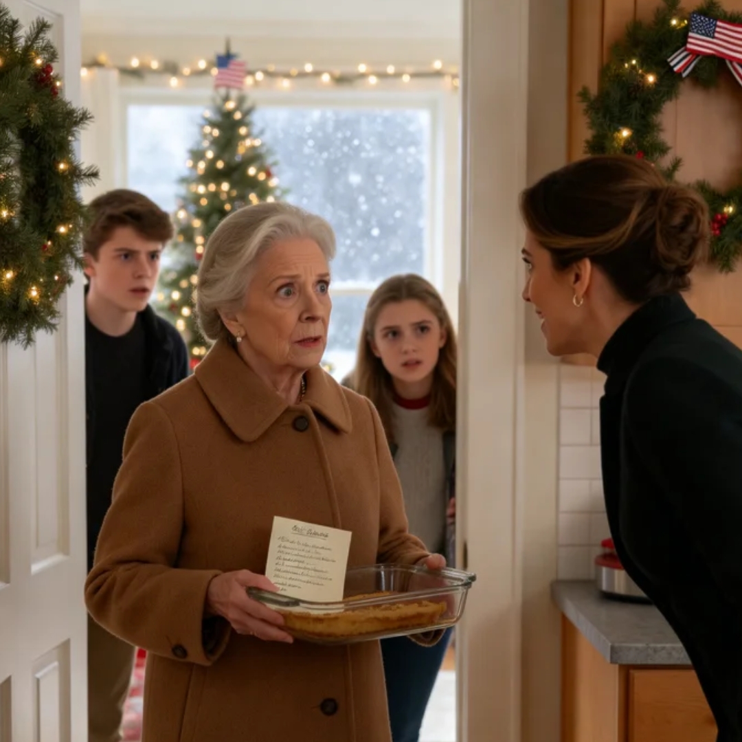 Behind her, the house looked like a magazine spread: twinkling lights, a towering tree draped in ribbon, stockings lined up in matching velvet. It smelled like pine and cinnamon and the expensive candles people buy when they want their home to feel like a promise.