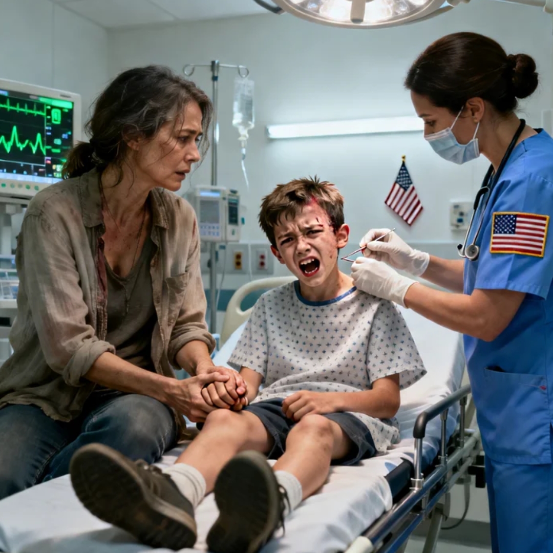 I sat on the edge of a gurney with my arm strapped to my chest, numb from shock and pain meds that hadn’t kicked in yet, while a nurse stitched my ten-year-old son’s forehead in slow, careful loops. Caleb didn’t cry. He just stared at the ceiling with a kind of frozen bravery that only children have—when their bodies are terrified but their minds haven’t learned how to fall apart.