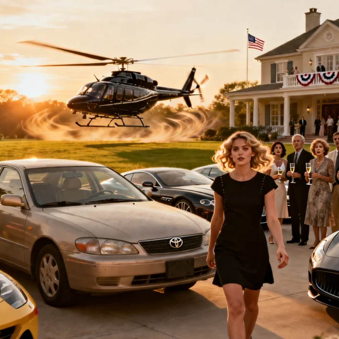 My old Toyota Camry coughed once as I rolled through the long driveway, the kind lined with imported palms and security cameras that watched you like you were already guilty. Beyond the gates, the scene was the usual parade of wealth—Bentleys, Maseratis, and enough German engineering to start a boutique dealership. My cousin Diego’s Ferrari sat front and center, angled like a magazine cover, because Diego didn’t park vehicles—he staged them.