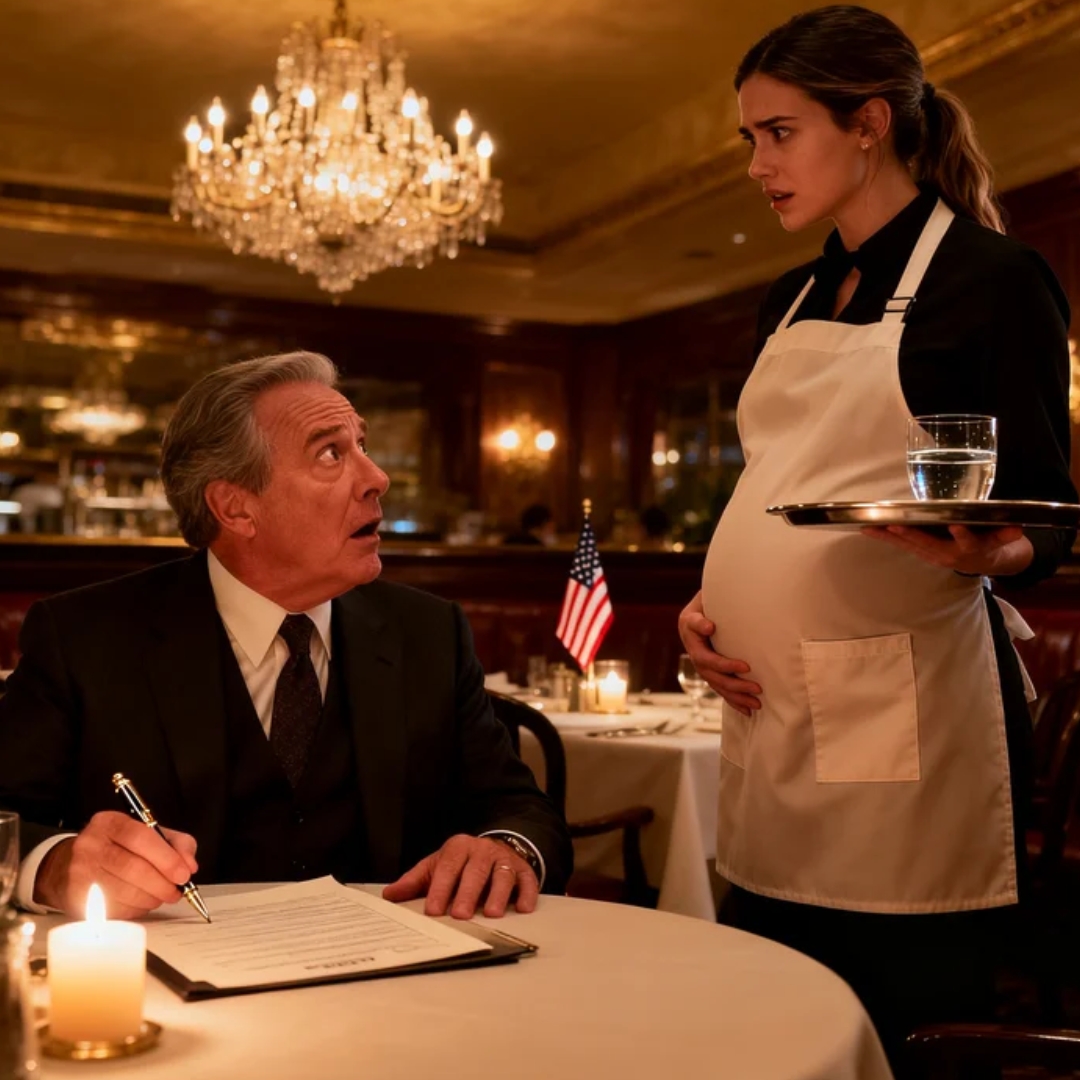 Heads turned across the dining room. Candlelight trembled in crystal glasses. A violin arrangement drifted through Belmont’s, the kind of expensive Philadelphia restaurant where men signed eight-figure deals over dry-aged steak and Napa cabernet. Outside, February sleet traced silver lines down the windows. Inside, a pregnant waitress in a faded black apron froze beside my table, one hand pressed instinctively to the underside of her belly, the other still gripping a water pitcher.