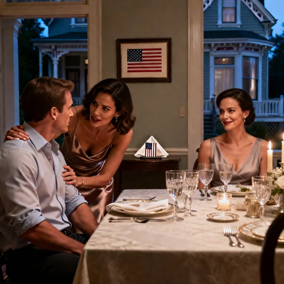 It was under the soft, golden glow of my dining room chandelier—while the smell of rosemary chicken filled the air, my wedding china gleamed like a promise, and my husband’s ex-girlfriend sat at my table like she owned the place.