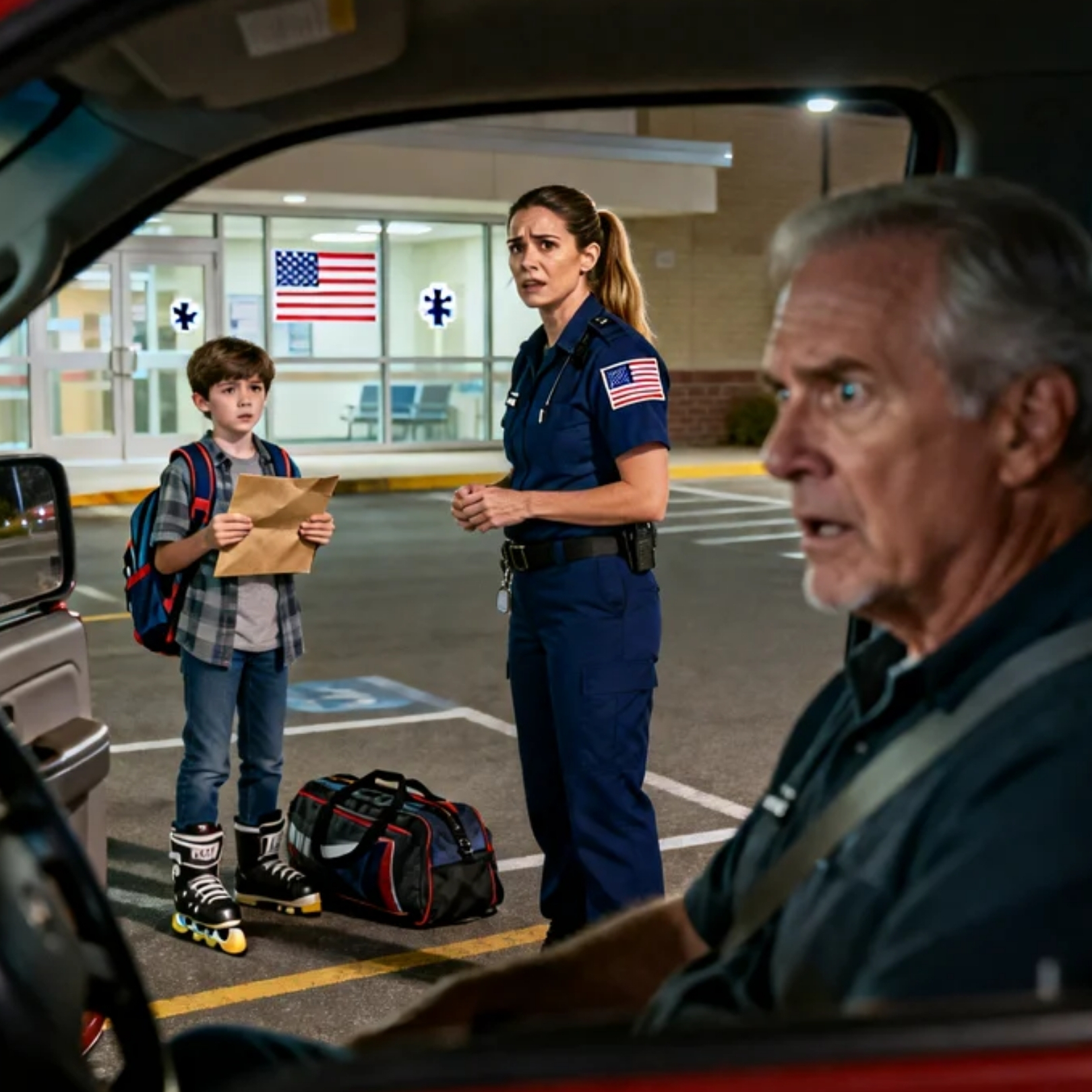 A paramedic in navy-blue uniform, shoulders squared like she was bracing for impact, standing under the harsh white glare of a parking-lot lamp that hadn’t needed to be on at two in the afternoon but was anyway. Her hair was yanked back into that no-nonsense ponytail first responders wear because nobody’s life gets saved by looking cute. Next to her was a boy with a hockey bag slumped at his feet and a school backpack hanging off one shoulder like it weighed too much for his ten-year-old spine.