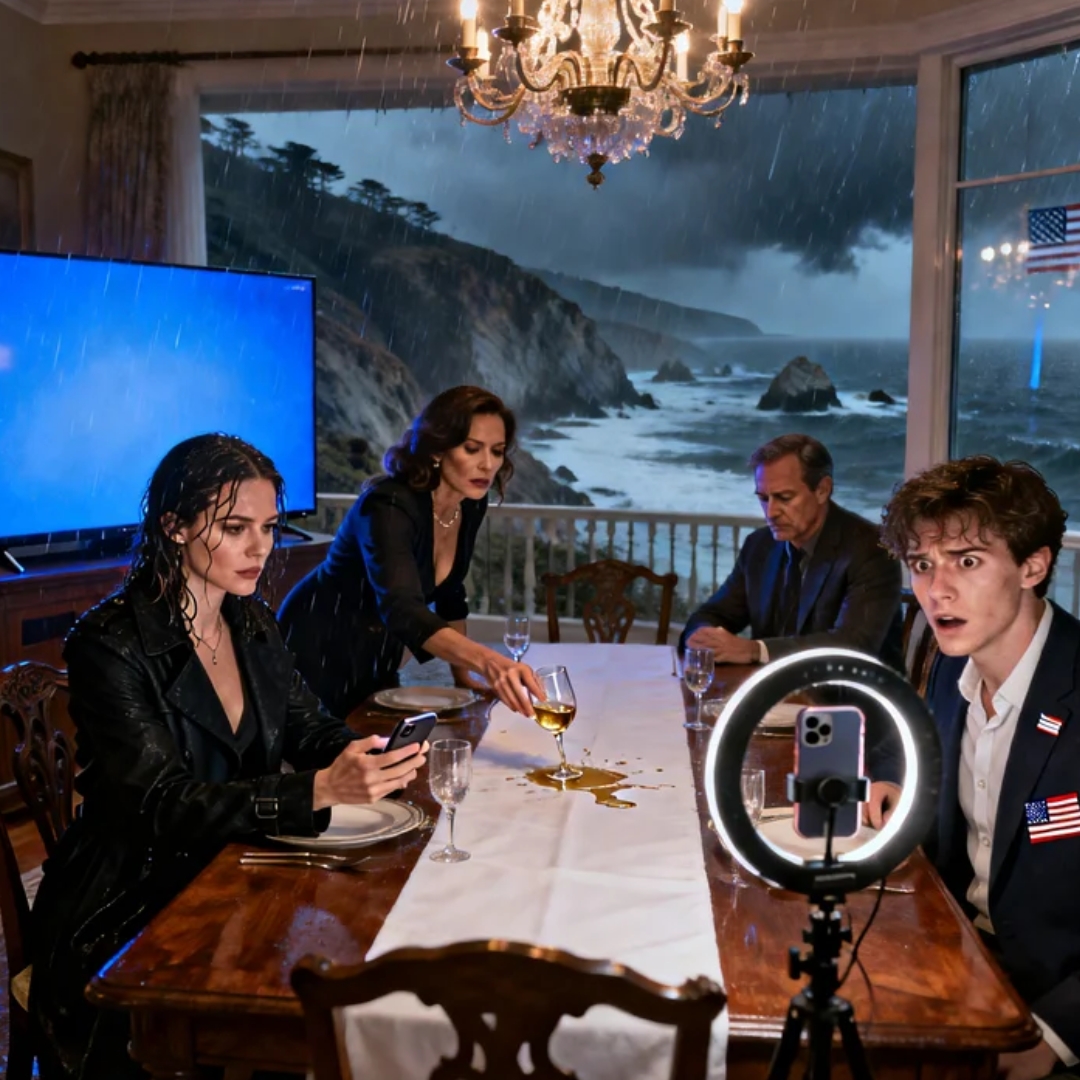 I stood at the edge of the crowd, my coat already drenched, watching the mansion loom above us like a glass knife.