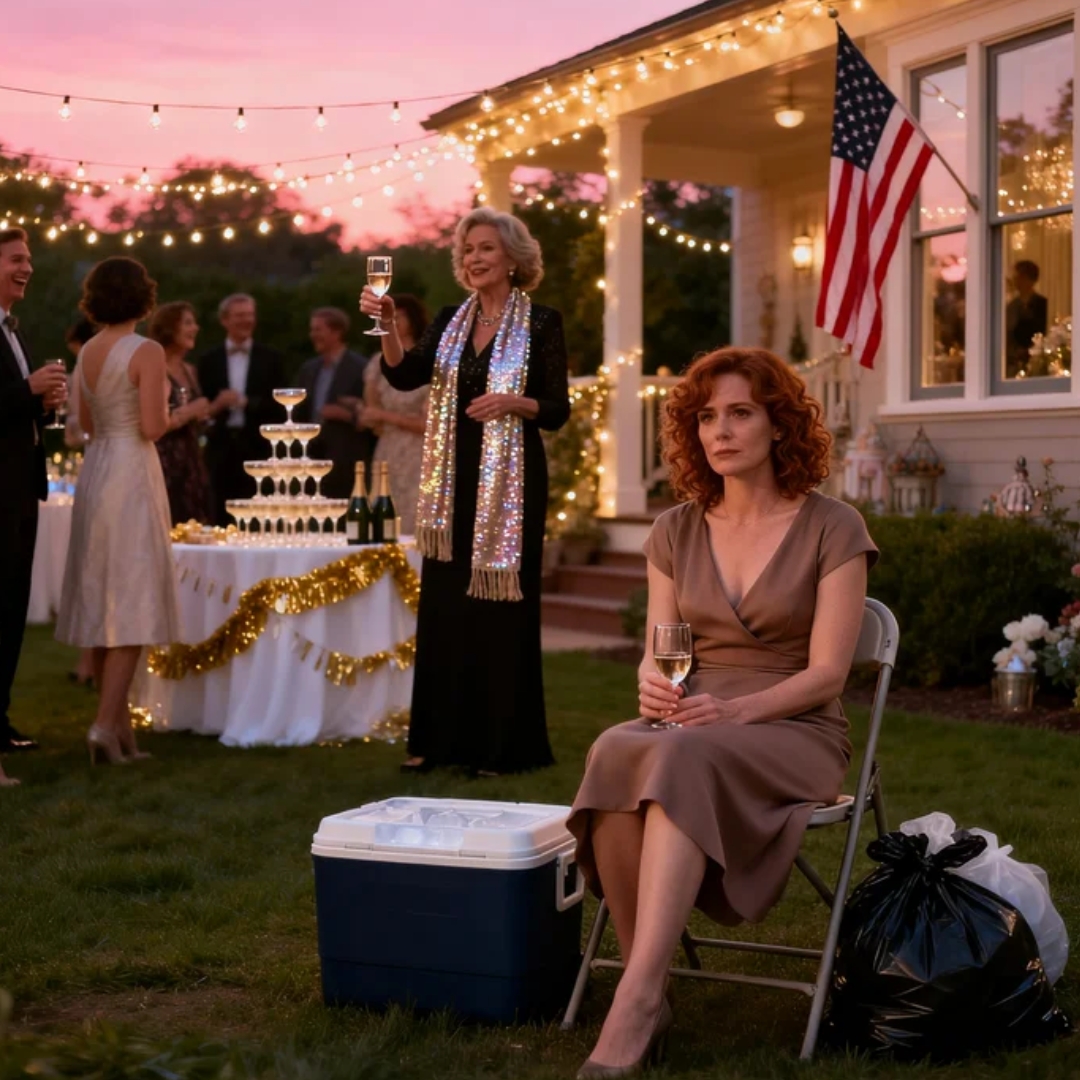 That was the first thing I noticed at my sister’s birthday party—not the fairy lights strung across the backyard like borrowed stars, not the champagne tower catching the late California sun, not the string quartet in matching black gliding through a version of elegance my family had always admired more than understood. No. What I noticed first was that my chair had been placed beside a dented silver cooler and two oversized black trash bags knotted at the top, the plastic still shining with condensation as if even the garbage had been given a more deliberate place than I had.