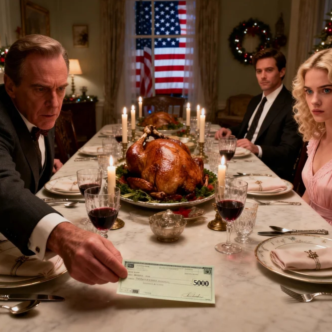 The check slid across the Thanksgiving table and stopped in a halo of turkey grease, five thousand dollars catching the chandelier light like an insult dressed up as generosity.