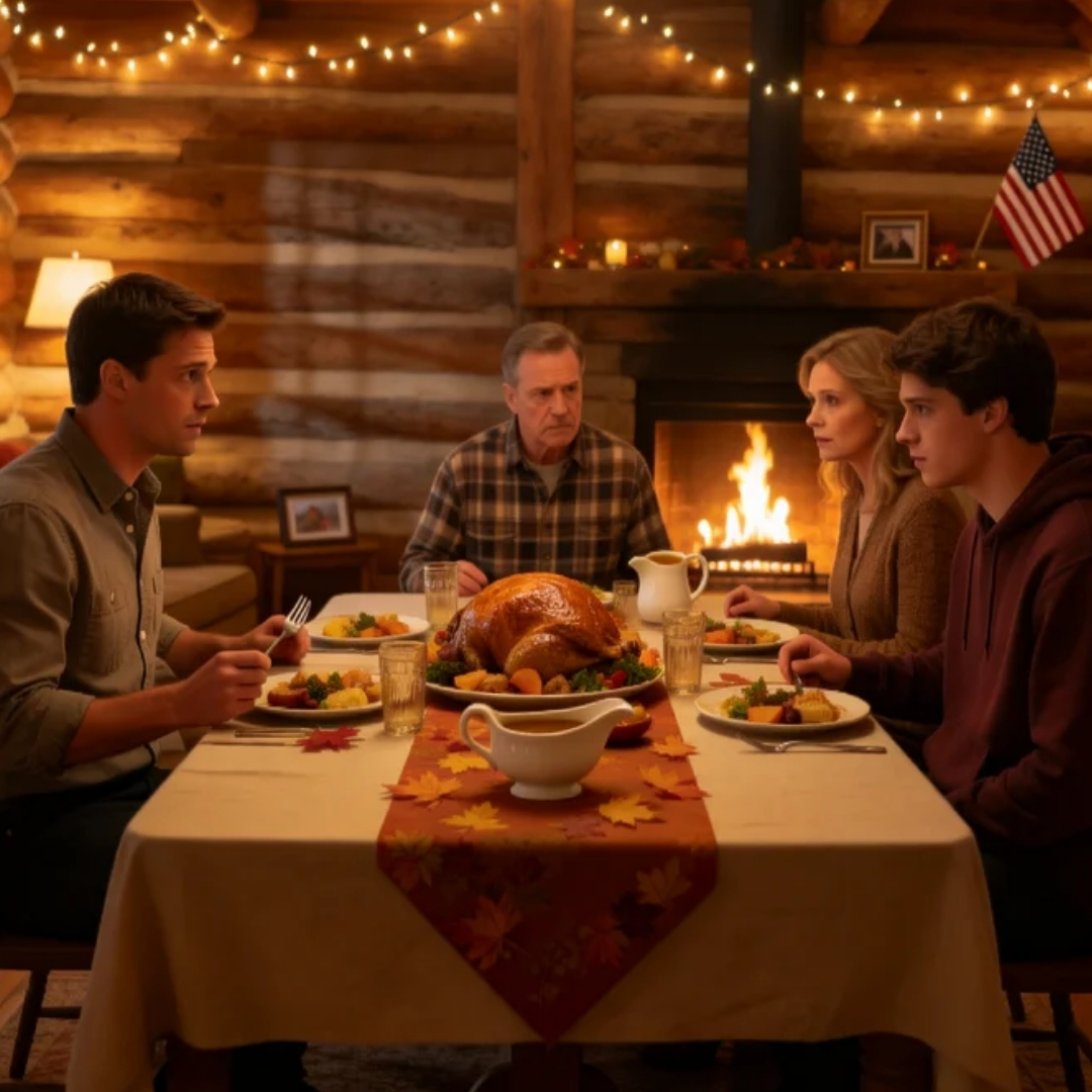 The cabin always did that. From the outside it was all postcard America—pine trees, woodsmoke, a wreath on the door, window light spilling onto the porch like honey. Inside, it was staged with the precision of a catalog shoot: the long dining table polished to a shine, the cloth napkins folded into sharp little triangles, the wine glasses aligned like soldiers waiting for orders. Even the air smelled rehearsed—rosemary, turkey, cinnamon, and the faint metallic bite of the fireplace as it breathed.