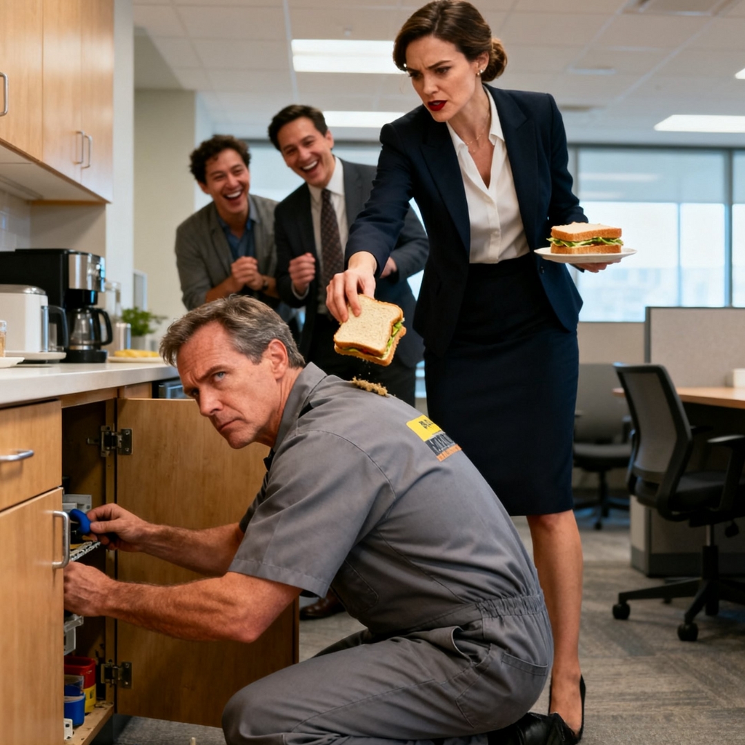 Thursday afternoon. Break room. I was kneeling by a loose cabinet door, tightening screws—the kind of maintenance that keeps an office from falling apart while the people in suits pretend the building runs on ambition.