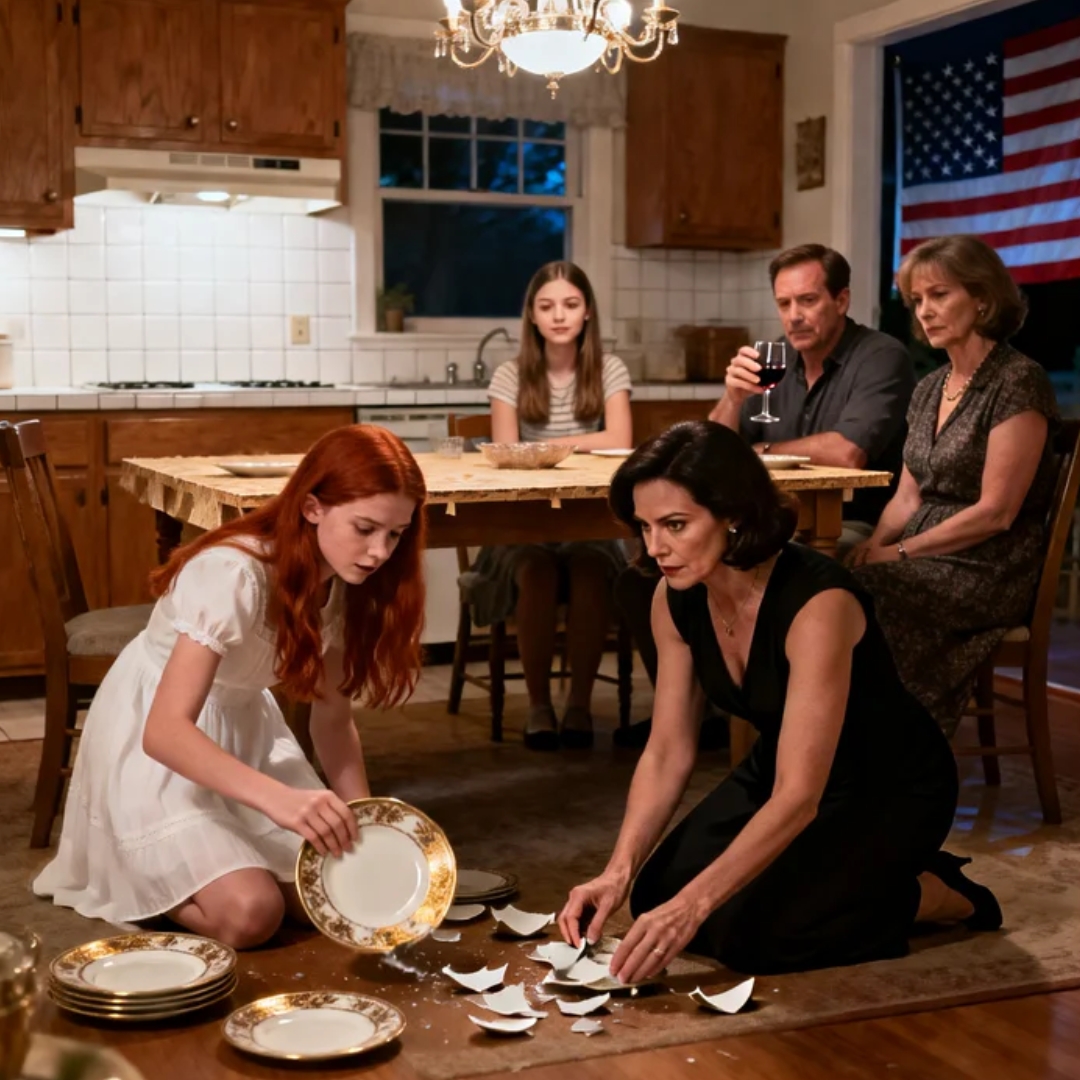 The plate dropped, shattered against the tile with a violent crack. Cream and chocolate smeared across the floor like a mess someone had been waiting to make.