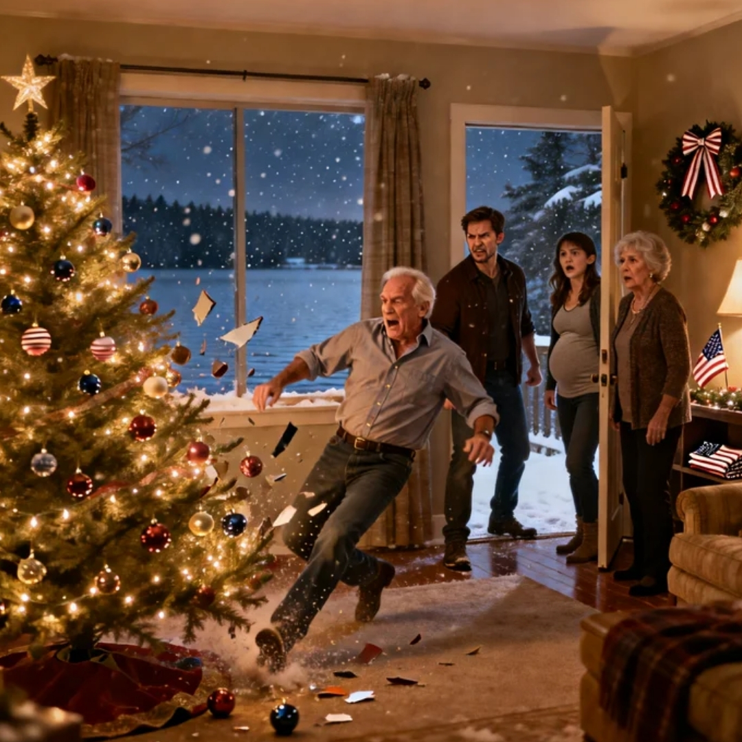 I’d fallen backward into the tree, the one my late wife used to fuss over until it looked like a magazine cover. Glass ornaments shattered on the hardwood. A strand of tinsel slid down my shoulder like a cheap insult.