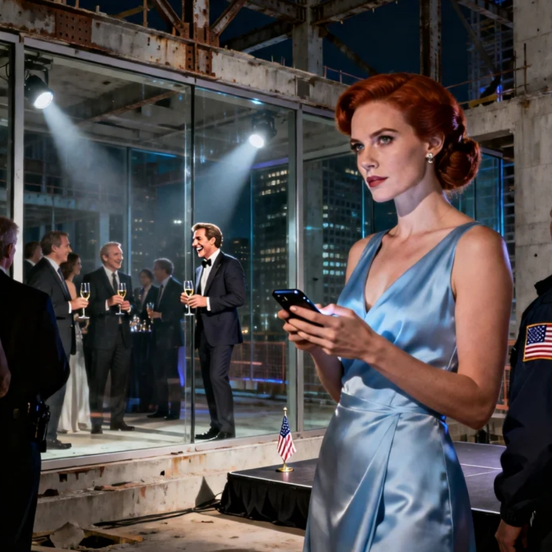The champagne flute in my hand was Waterford-cold against my fingertips, but Joseph’s words were colder. We were standing on a wind-battered construction deck high above a West Coast city that never slept, the kind of night where investors wore tailored coats over tuxedos and the skyline glittered like it was auditioning for a magazine cover. Below us, traffic braided through the streets in ribbons of white and red. Above us, cranes stood like giant insects, frozen mid-build. Somewhere nearby, a string quartet forced Vivaldi into the raw bones of an unfinished lobby, trying to make rebar sound romantic.