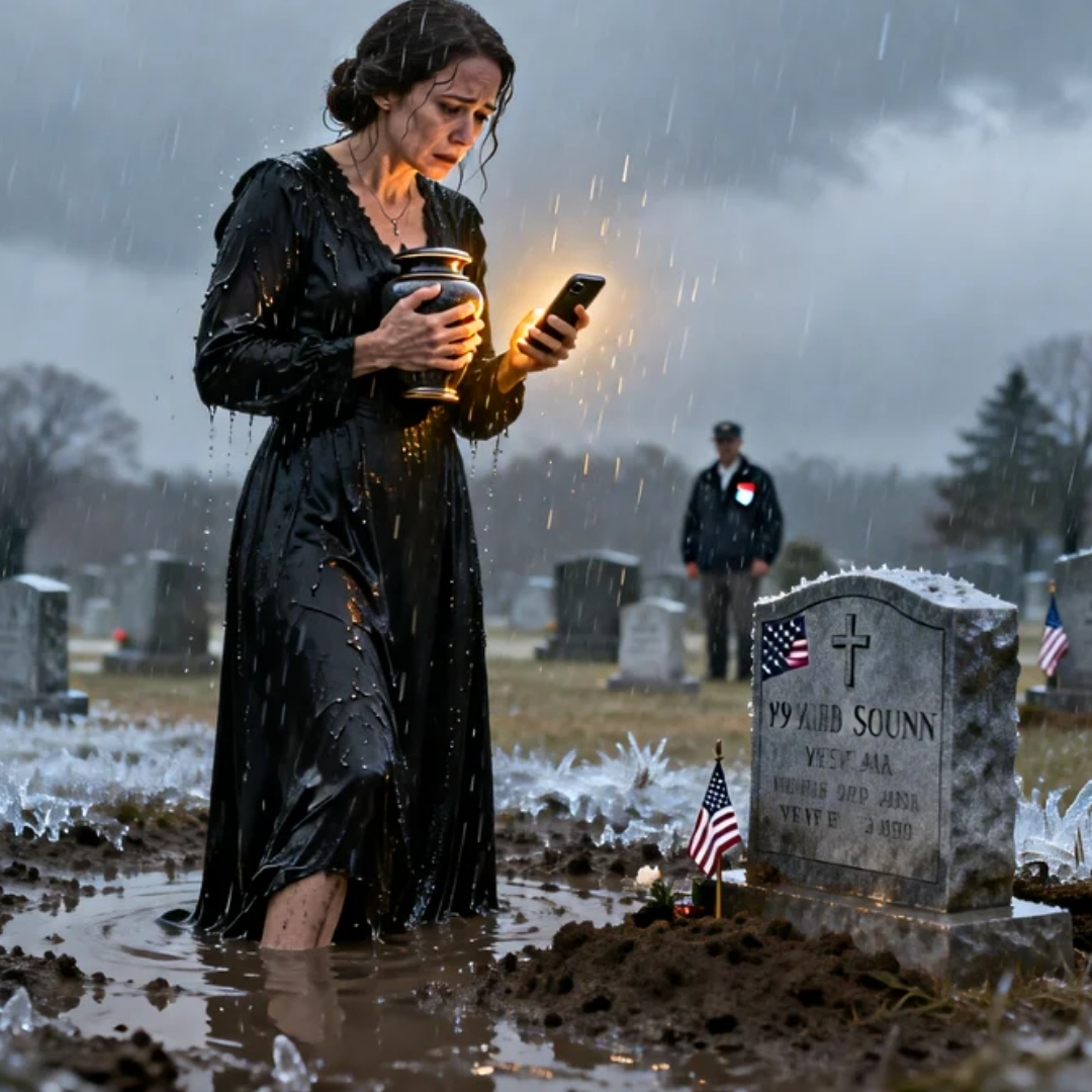 It came down in thick, slanting sheets that turned the cemetery into a shallow lake, swallowing my shoes, sucking at my ankles, pulling like it wanted to drag me under with the fresh earth. My black dress clung to my skin. My hair stuck to my face. And in my hands—so light it felt like a cruel joke—I held a small box of ashes that should have weighed a thousand pounds.