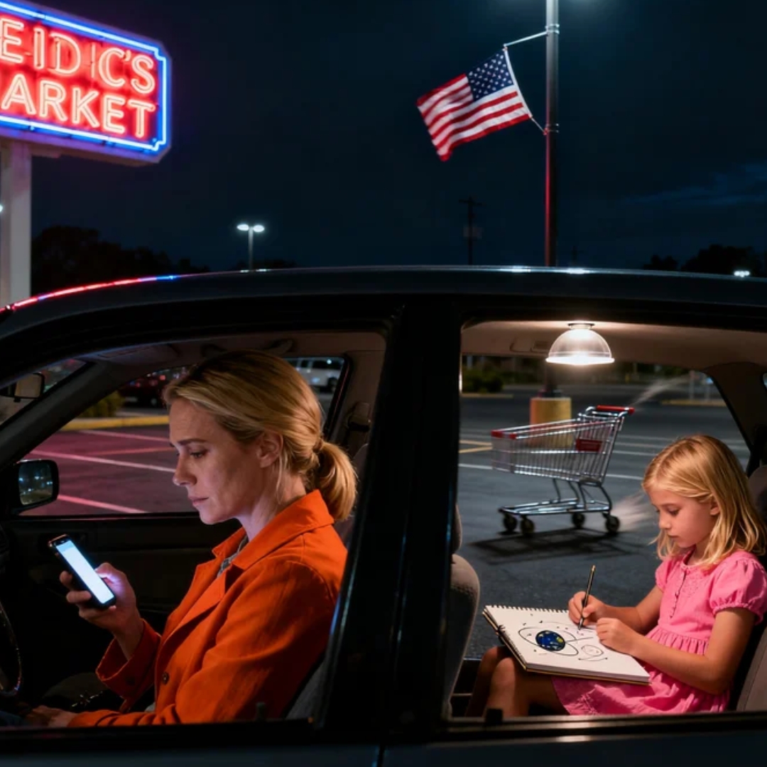 In the back seat, my nine-year-old daughter Remy sat cross-legged under the dome light, completely absorbed in a spiral notebook, drawing planets like the world outside our car wasn’t trying to claw its way inside.