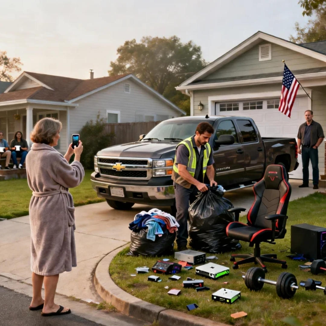 A black trash bag belly-up near the mailbox. A dumbbell rolling slowly downhill like it was trying to escape. The shredded remains of an Xbox controller glinting beside the driveway. My clothes—my actual clothes—stuffed into plastic like a crime scene cleanup. And standing in the middle of it all, framed by the garage door like she’d staged a premiere, was my mother in a bathrobe, slippers, and the cold blue glow of her phone held up to record.