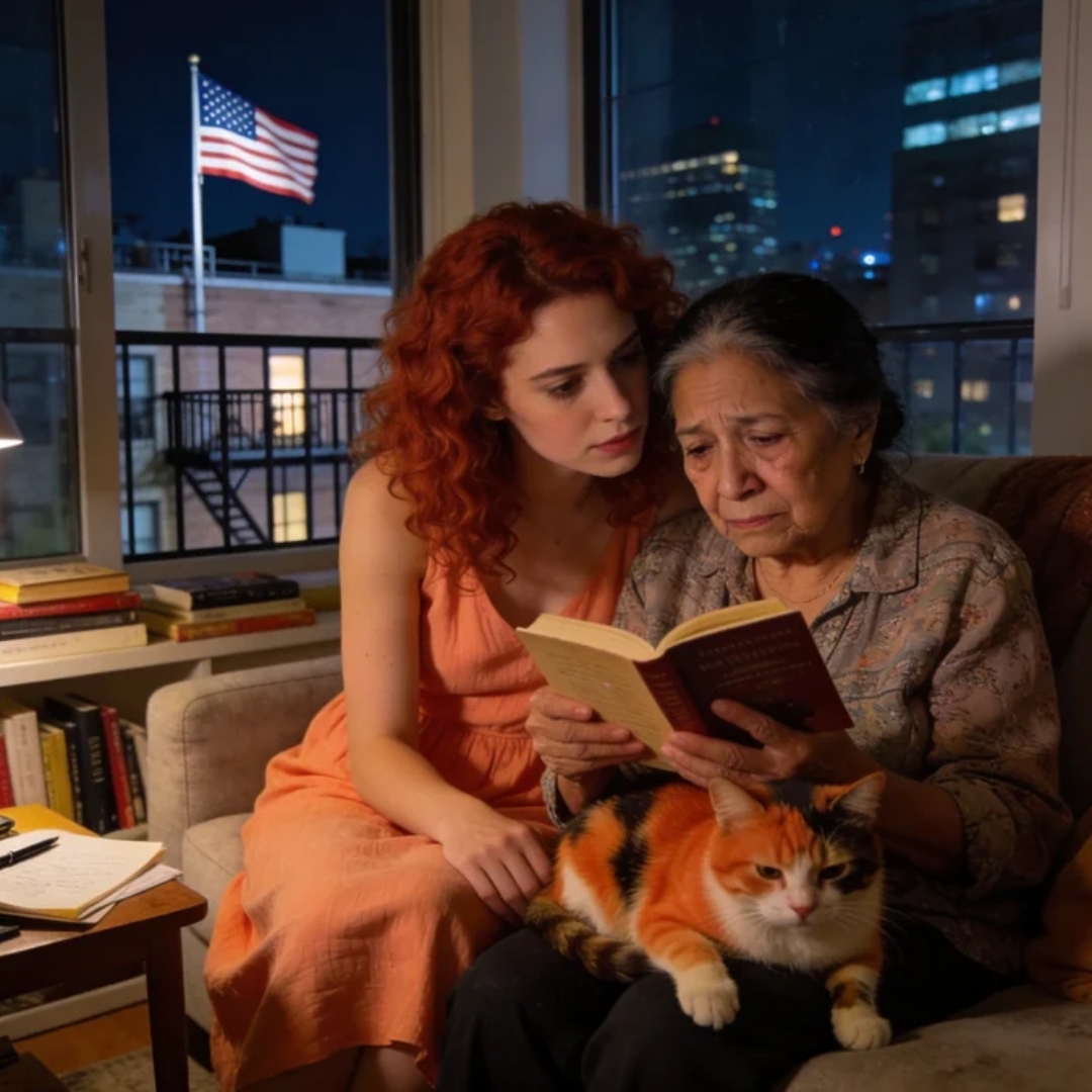 She spoke the words slowly, as if they were fragile glass she was afraid of dropping. Then she looked up from the page, seventy-six years old, cheeks wet, hands trembling, and the room went so quiet I could hear the radiator hiss and the city traffic seven floors below our windows on West 58th humming through the November dark. My cat Oliver, who usually considered human emotion a private inconvenience, jumped off the couch and stalked into the bedroom with visible disapproval. Eleanor didn’t notice. I barely did. Because the woman sitting beside me on that thrift-store sofa, in her pale blue cardigan and sensible shoes, had just done something she had been told by life, by poverty, by time, by shame, and by America itself that she would never do.