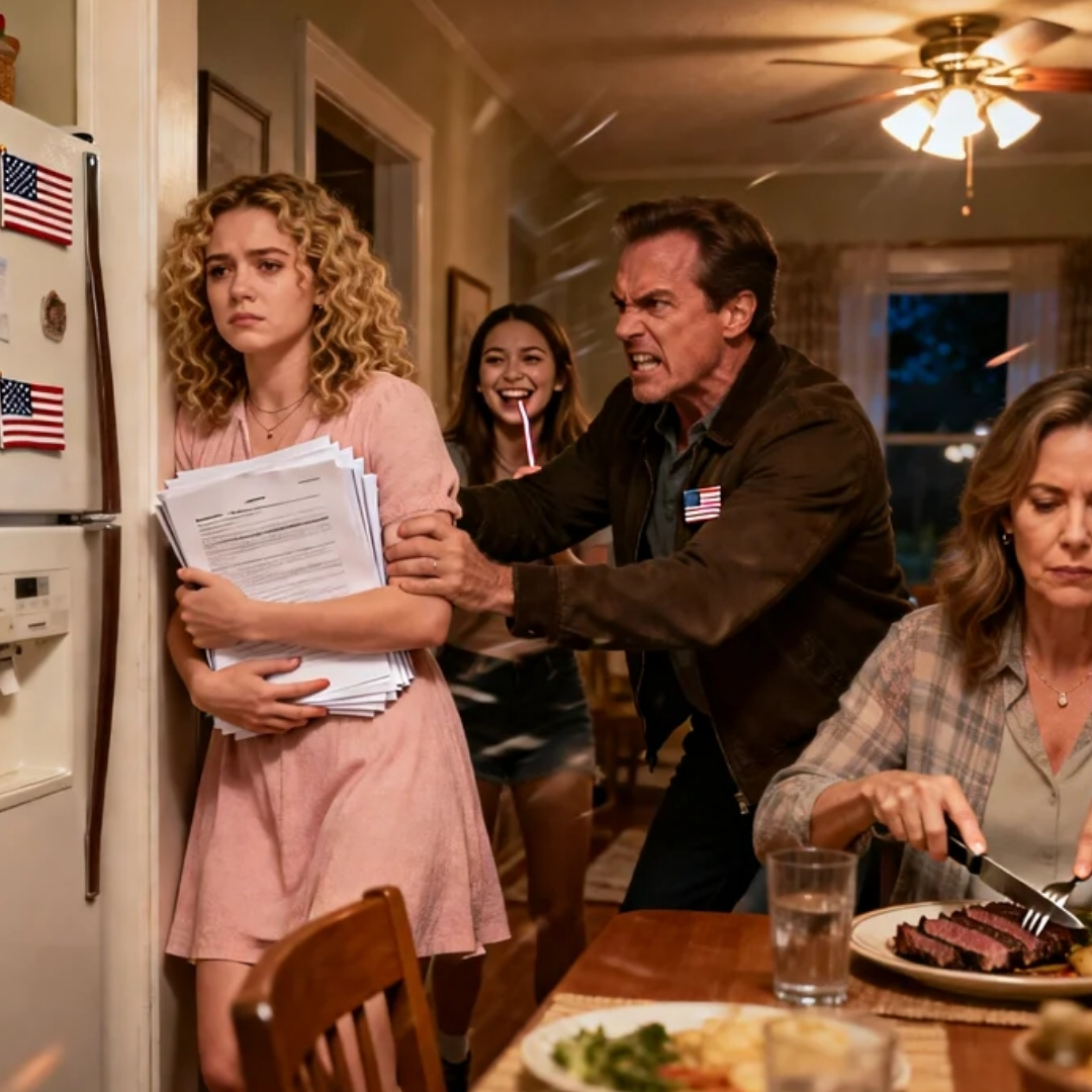 It split in a jagged line behind my shoulder when my father’s hand shoved me into the hallway wall, the family portrait rattling in its cheap brass frame as if even it wanted out of that house. The sound was sharp, violent in a way that didn’t leave blood but left something worse—a silence so complete you could hear the refrigerator humming in the kitchen.