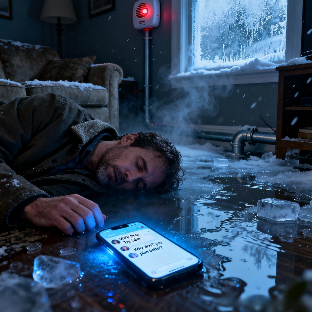 A paramedic would tell me later how strange it looked: a small Colorado house in the middle of a historic U.S. cold snap, pipes burst, ceilings raining, carbon monoxide alarm screaming, and one cracked phone screen lighting the dark with a family group chat that read less like support and more like a receipt.