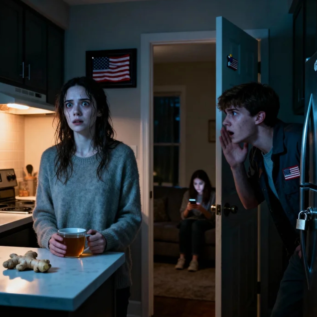 He leaned in close enough that I could smell the sharp metal tang on his breath, like pennies and fear. His hands trembled around his tool bag. His eyes flicked once—twice—toward the hallway where my sister sat scrolling her phone as if she had all the time in the world.