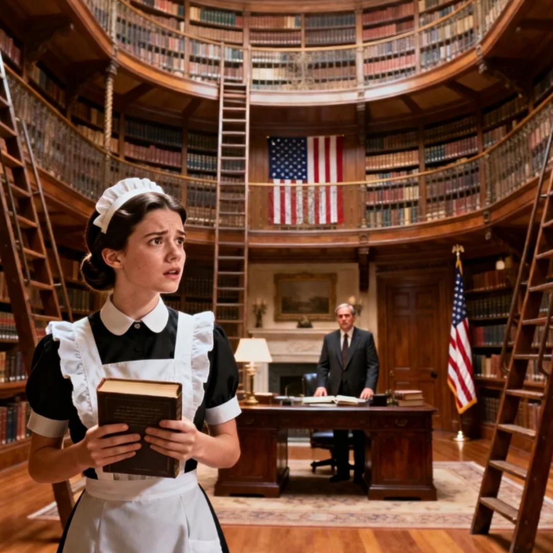 Lightning flashed over the hills beyond the estate, bright enough to illuminate three stories of books in a single white breath of light—shelves stacked so high they needed rolling ladders, old oak balconies running around the walls, and rows upon rows of spines that looked like the private memory of half of Western civilization.