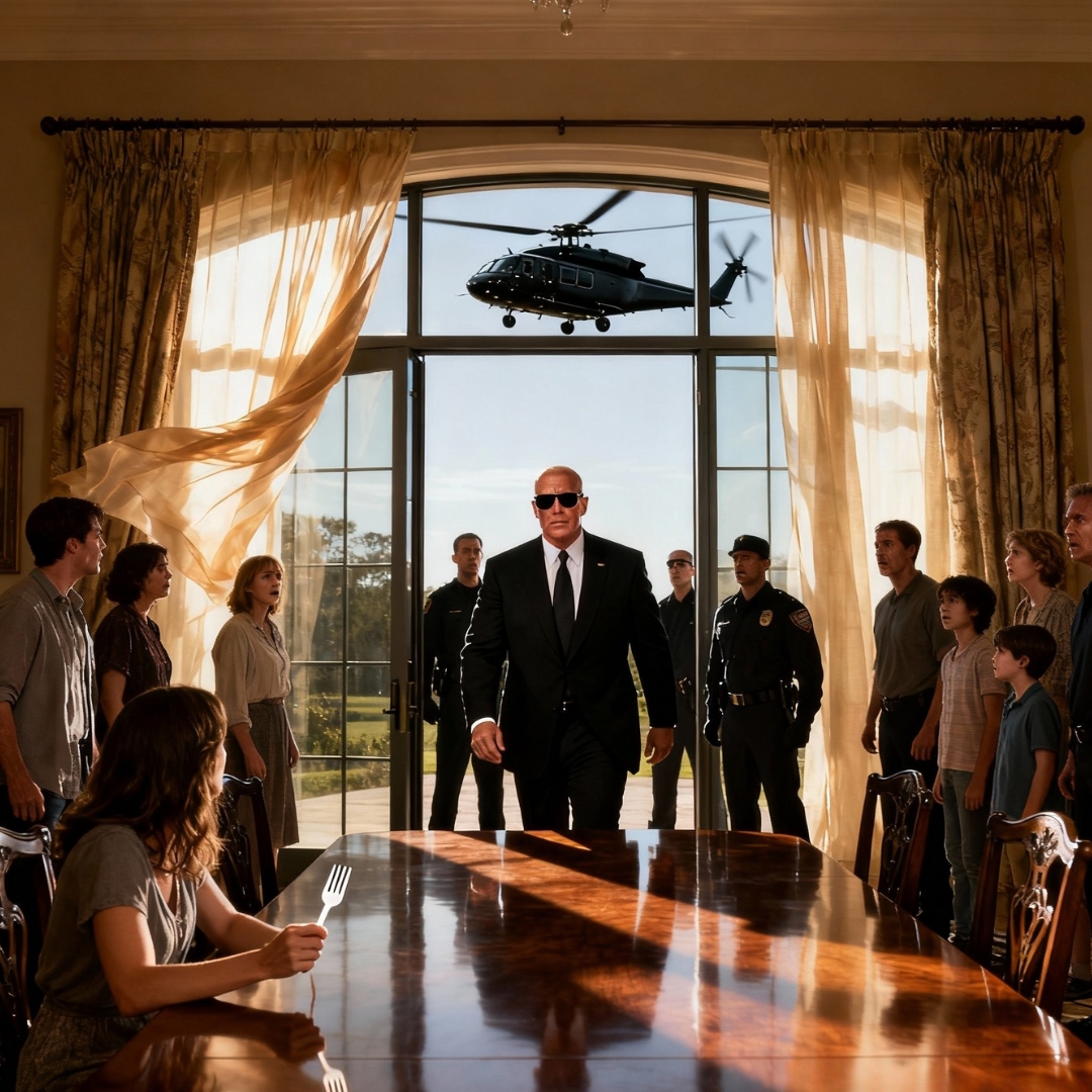 It hung there like something straight off a movie set, rotors slicing the air, sending leaves spinning, making the American flag by the fence whip and crack. The sunlight hit its sleek surface, and for a moment, the whole dining room looked like it was underwater, shadows spinning over the ceiling.