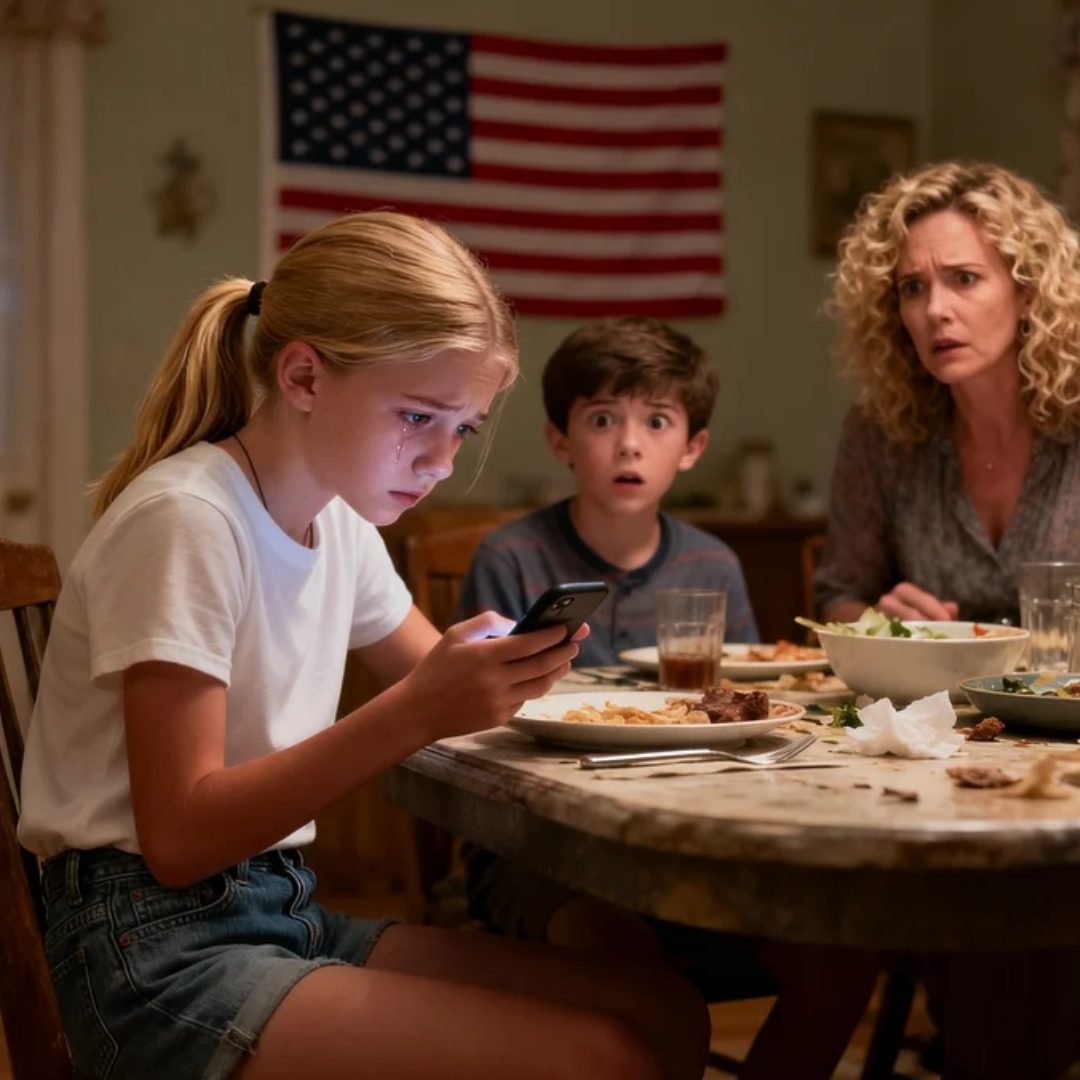 Thirteen, too old to cry over nothing, too young to pretend she didn’t care. Her fork hovered mid-air as her phone lit up beside her plate. The glow caught in her eyes before the tears did.