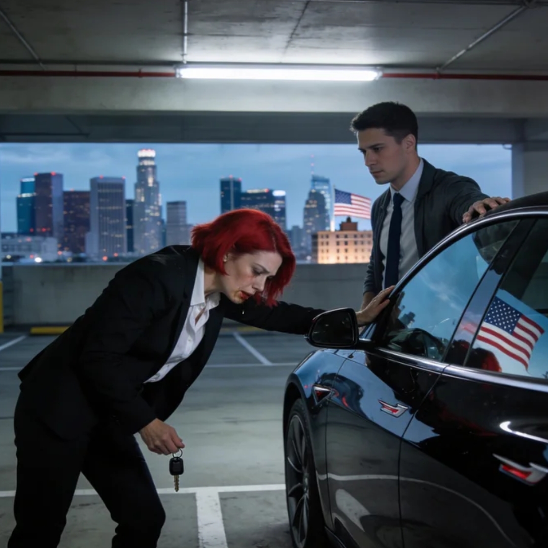 And she was walking toward a black Tesla parked near the elevator.