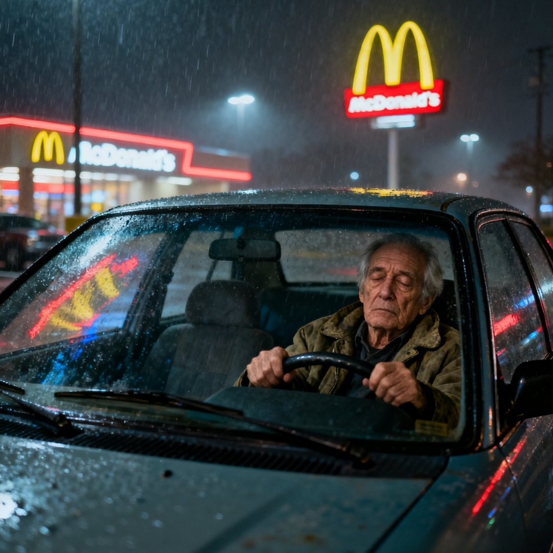 Neon light bled across my windshield like a warning sign, turning the McDonald’s “M” into a crooked halo over a man who’d run out of places to go.