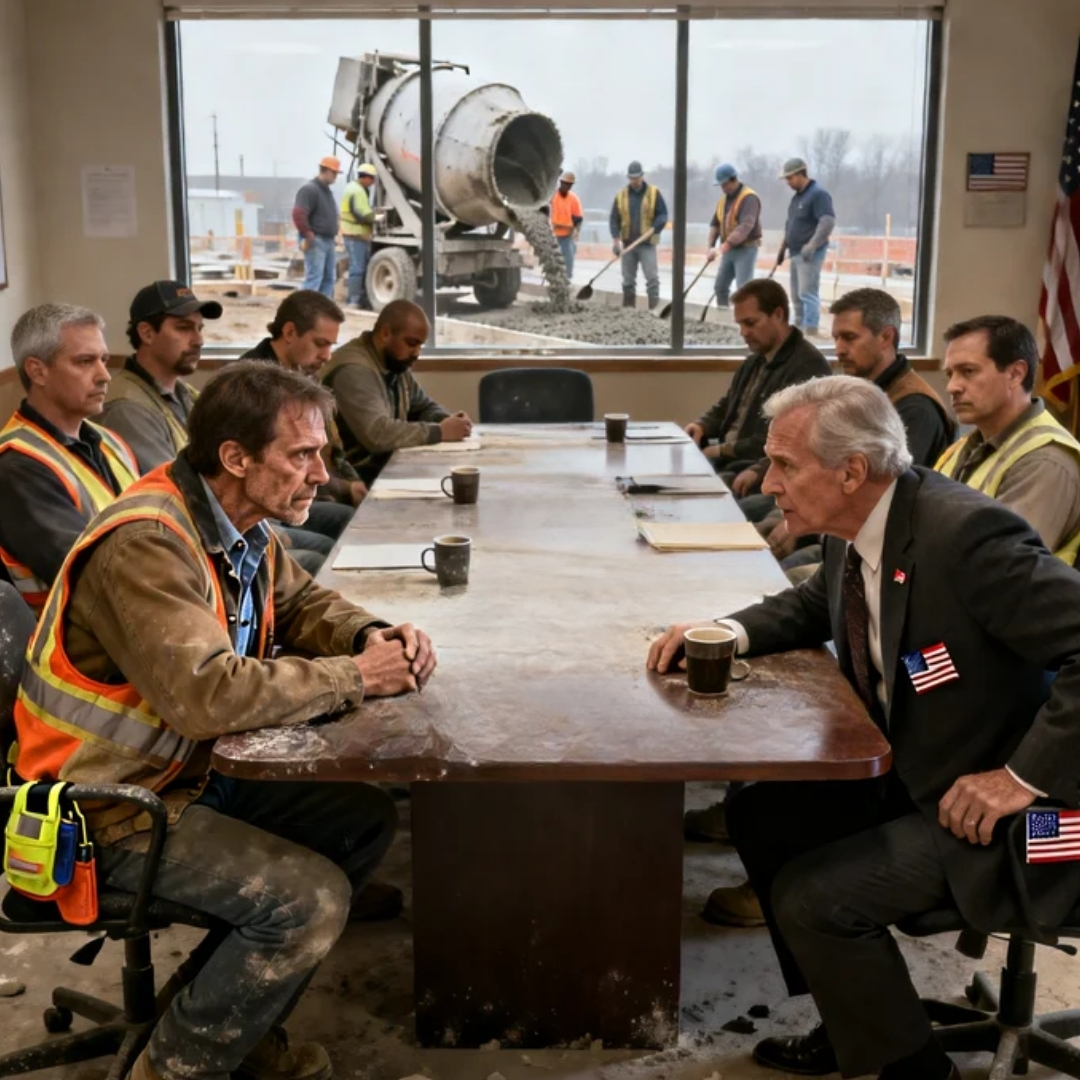 Outside the window, you could hear our crew gearing up for a morning pour—hard hats clacking, a tailgate dropping, someone laughing too loud because that’s what men do when they’re about to do heavy work. Inside, no one moved. No one blinked.