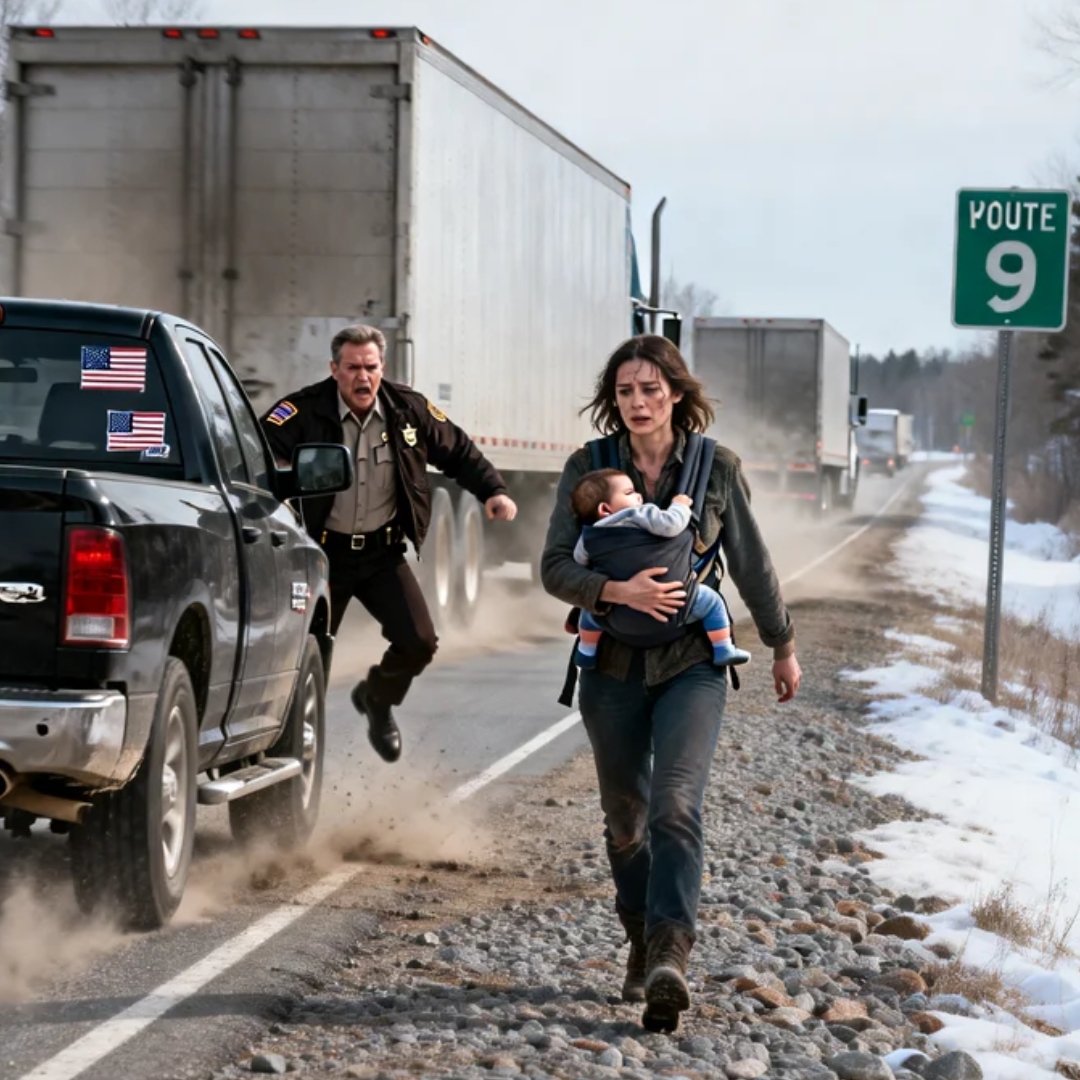 Gravel snapped under my shoes. The shoulder was narrow, more rumor than roadway, and the dark was loud—semi-trucks thundering past with their headlights slicing my face in white bands, the wind punching my ribs every time a rig roared by. Noah clung to me like he could fuse our bones together if he held tight enough. His little fingers twisted in my sweater. His cheek was damp with sleep and salt.