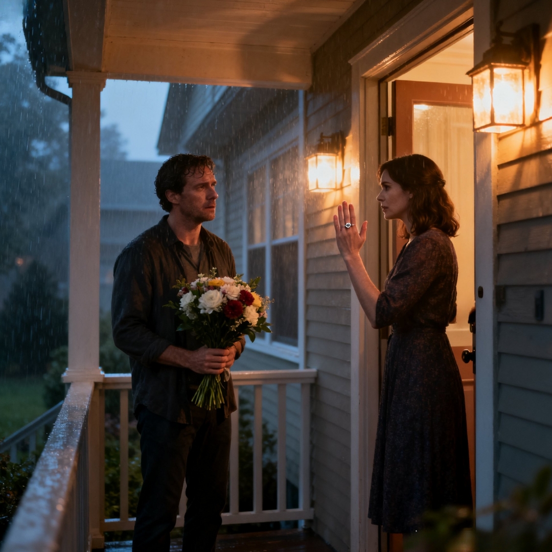 The bouquet slipped from his hand and hit the porch with a soft, pathetic thud.