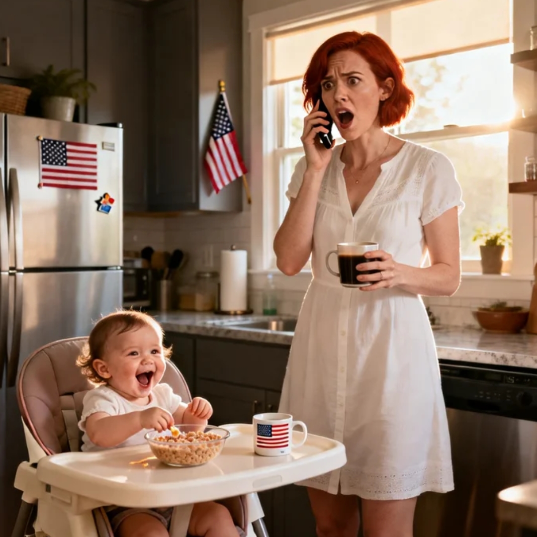 The air smelled like coffee and dish soap. The morning news murmured low from the TV in the living room. My one-year-old daughter, Emma, sat strapped into her high chair, smearing mashed banana across her cheeks like war paint, kicking her little feet as if the world had never hurt anyone.