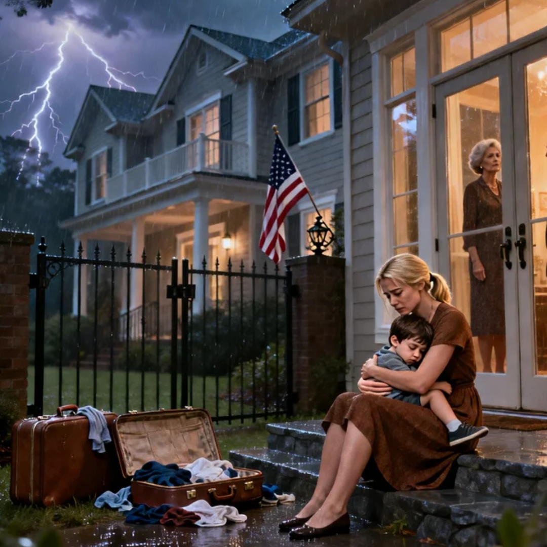 Mrs. Celeste Vance stood in the doorway in her pearl earrings and her fury, perfectly dry beneath the porch light. Behind her, my father-in-law—Mr. Ellis Vance—hovered like a shadow, refusing to look directly at me.