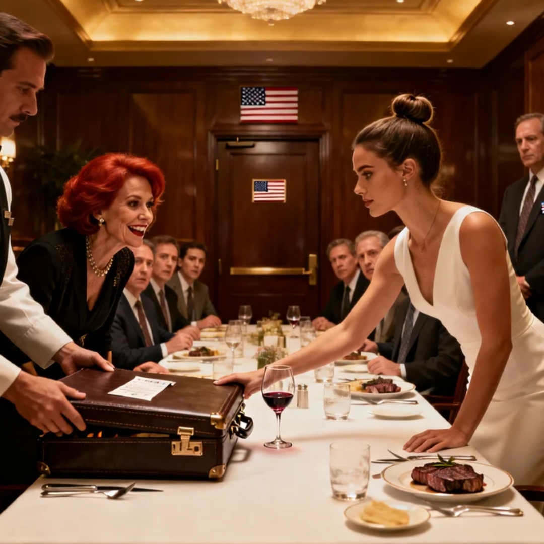 He walked straight to me—like he’d been instructed—and placed a heavy leather folder next to my water glass.