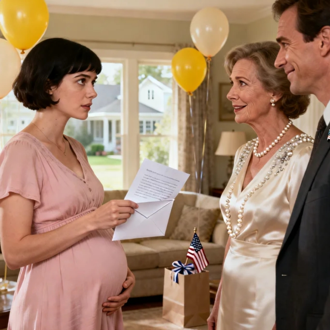 It was the kind of heavy you notice immediately—paper with intention, paper meant to hurt—passed into my hands with a smile that never reached my mother-in-law’s eyes. The living room around us glittered in soft afternoon light, all buttercream balloons and lemon-yellow streamers, like a Pinterest board brought to life in a quiet American suburb where the lawns were trimmed and the drama stayed behind curtains.