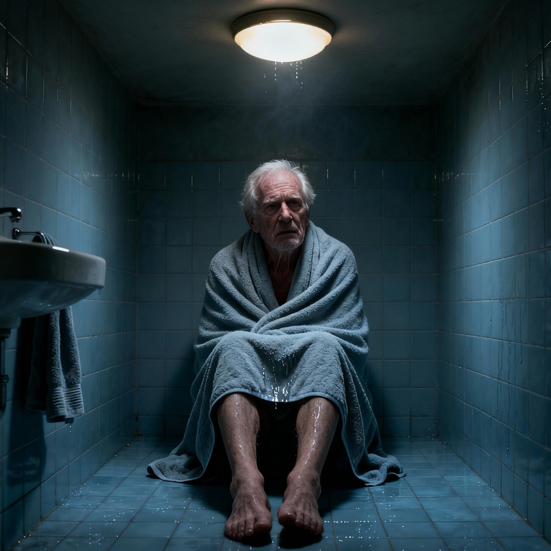 But in that instant, my whole world narrowed to four tile walls, a rattling vent, and a mirror that reflected a sixty-something man in a towel, blinking like he’d just been slapped awake.