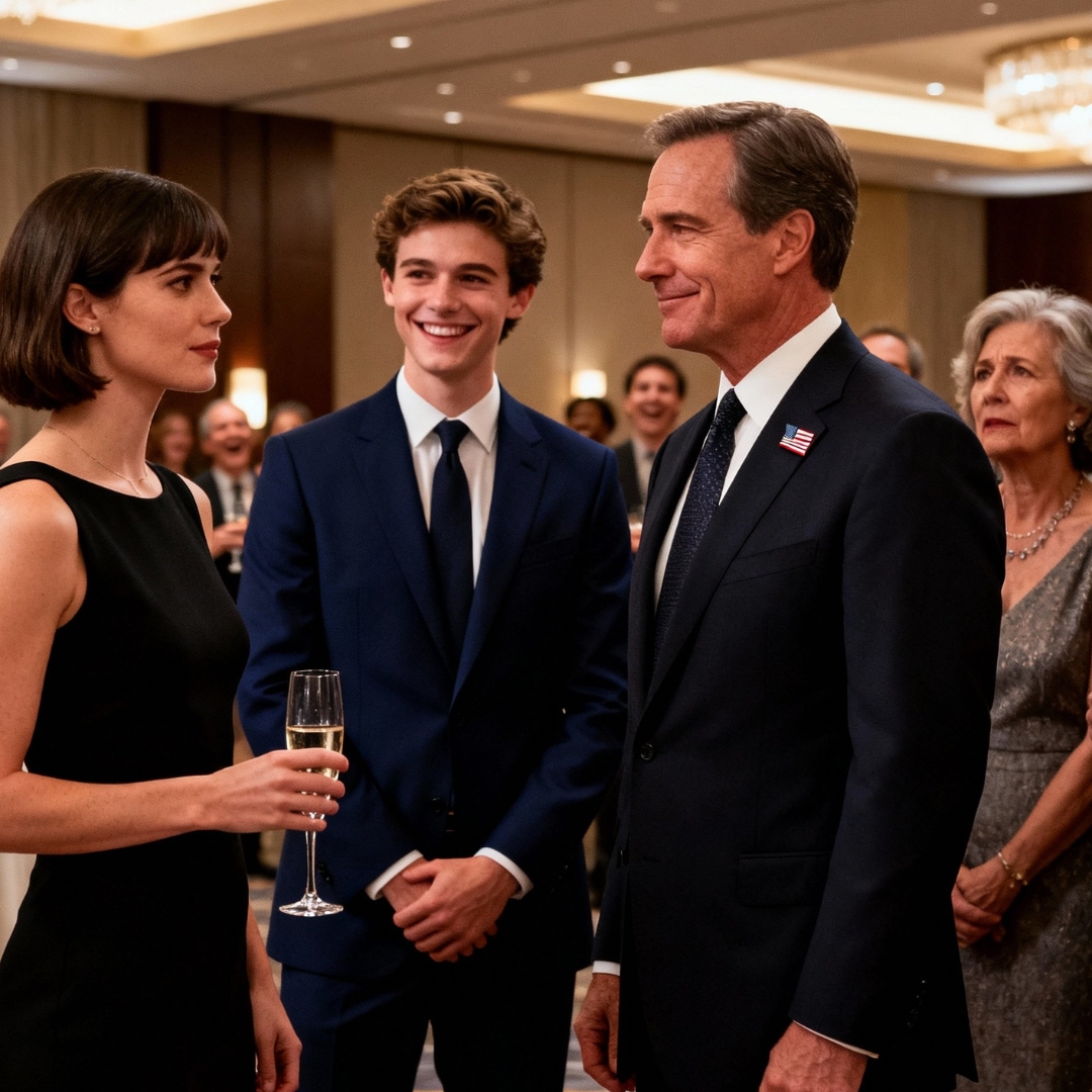 He angled his chin toward me with the theatrical generosity of a man tossing crumbs to a stray dog, and said—loud enough for the people in the front circle to hear, soft enough to feel intimate, like a private humiliation—