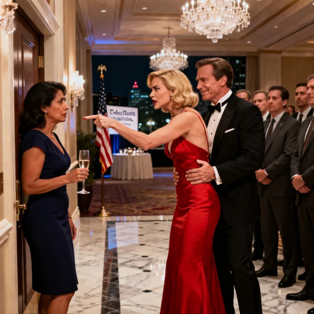 The woman speaking was blonde and polished, the kind of pretty that cost money. Her dress was white—too white, too bold for someone who wasn’t the bride. Sharp cheekbones. Sharp eyes. A smile that didn’t warm anything it touched.