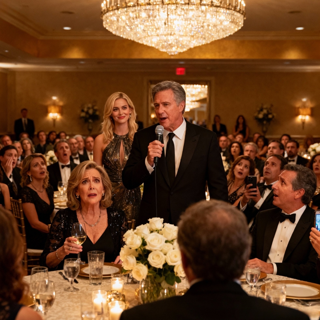 A hundred guests in evening gowns and tailored suits froze mid-gesture, champagne flutes trembling between manicured fingers. Somewhere near the stage, a band from Arlington strummed the wrong chord in confusion. And in the middle of it all—spotlit under the golden haze of chandeliers imported from Italy—stood her husband of twenty-five years, Darren Price, holding not an anniversary gift, but divorce papers.