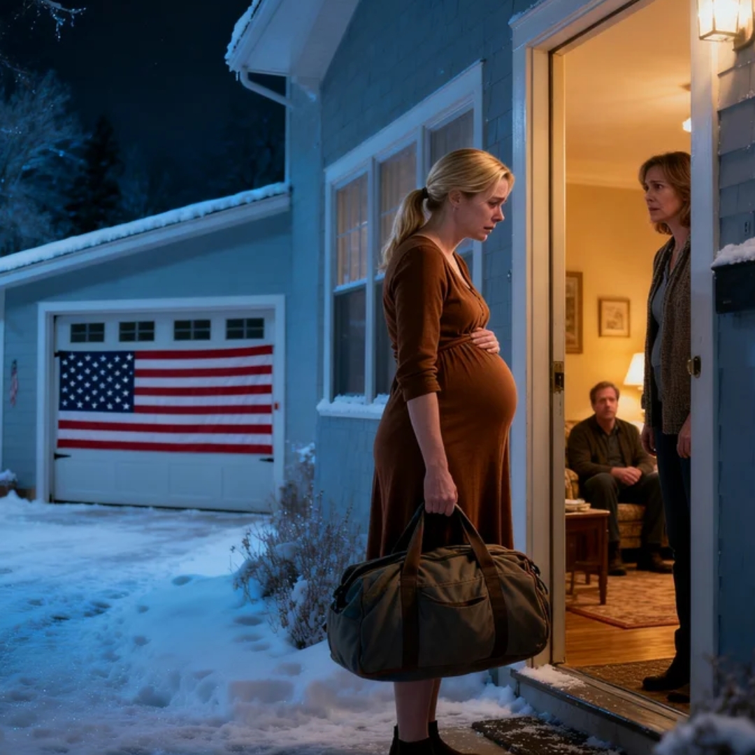 It landed with a soft, ugly thud against frozen wood, a red canvas bag with one broken zipper and a pair of sweatpants hanging halfway out, as if whoever packed it had been in a hurry to be rid of her. The January wind came hard across the yard, thin and mean, carrying that sharp Tennessee cold that cuts straight through a coat and into the bones. Somewhere down the street, a dog barked once and then went silent. The porch light over her parents’ front door buzzed and flickered. Inside, the television was still on.