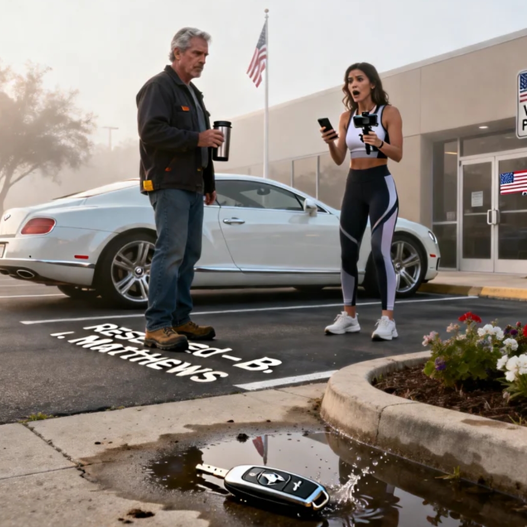 “Whatever, boomer.” She bent down, grabbed the keys from the puddle, and wiped them on her leggings like the pavement had offended her. “I’m leaving it right here. Touch it and I’ll get you fired. What’s your name?”