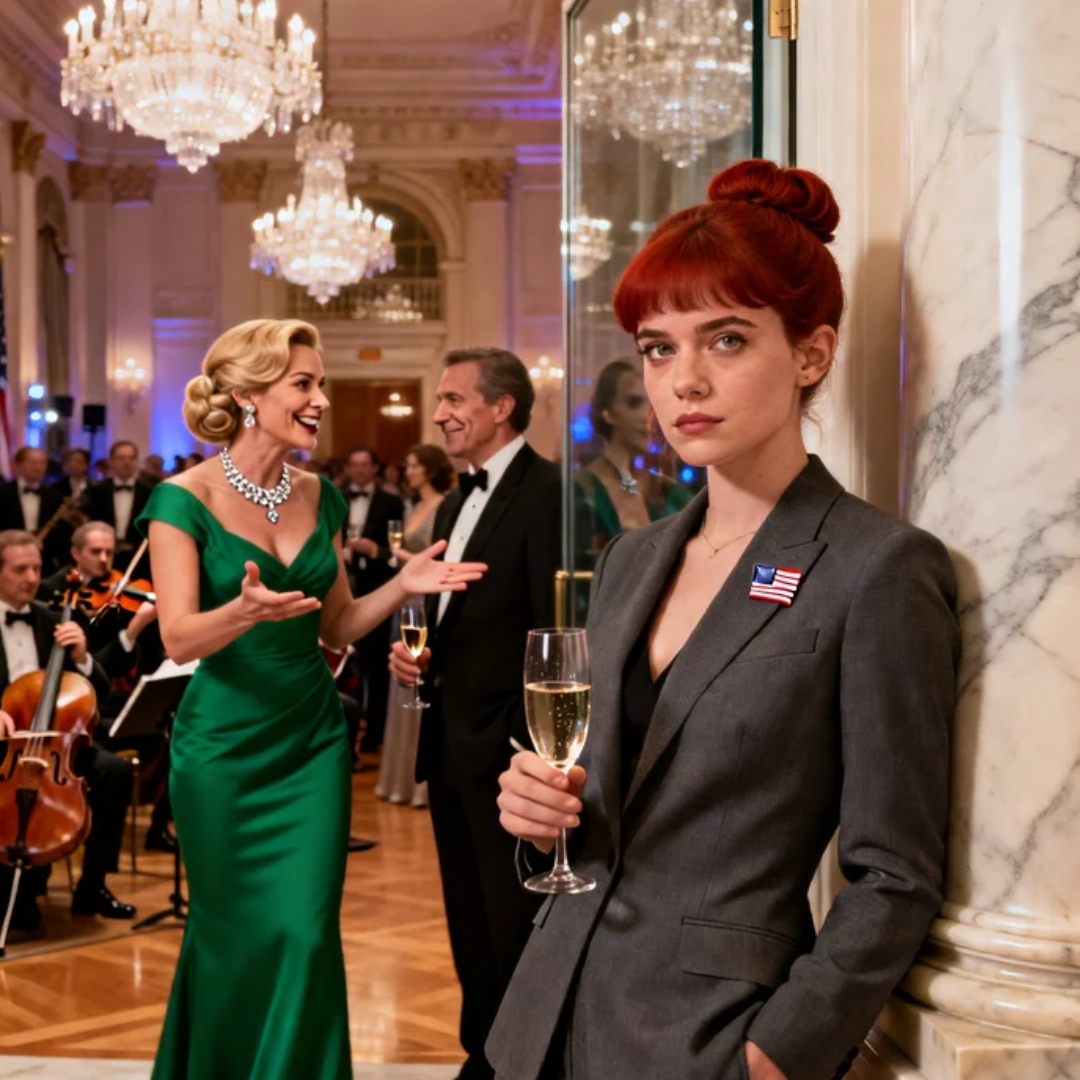 She stood near the dais like a crown jewel in a display case, draped in custom emerald silk that cost more than the annual salary of the people she pretended didn’t exist. Her hair fell in glossy waves. Her smile was rehearsed. She radiated that soft, lethal confidence of someone raised to believe the world is a mirror made exclusively for her face.