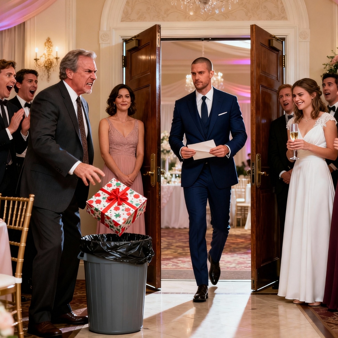 I hadn’t even made it three steps past the entrance when my father reached for the box in my hands—a heavy, beautifully wrapped gift with a silver bow I’d tied twice to get just right—snatched it like it offended him, and hurled it into the trash beside the cake table.