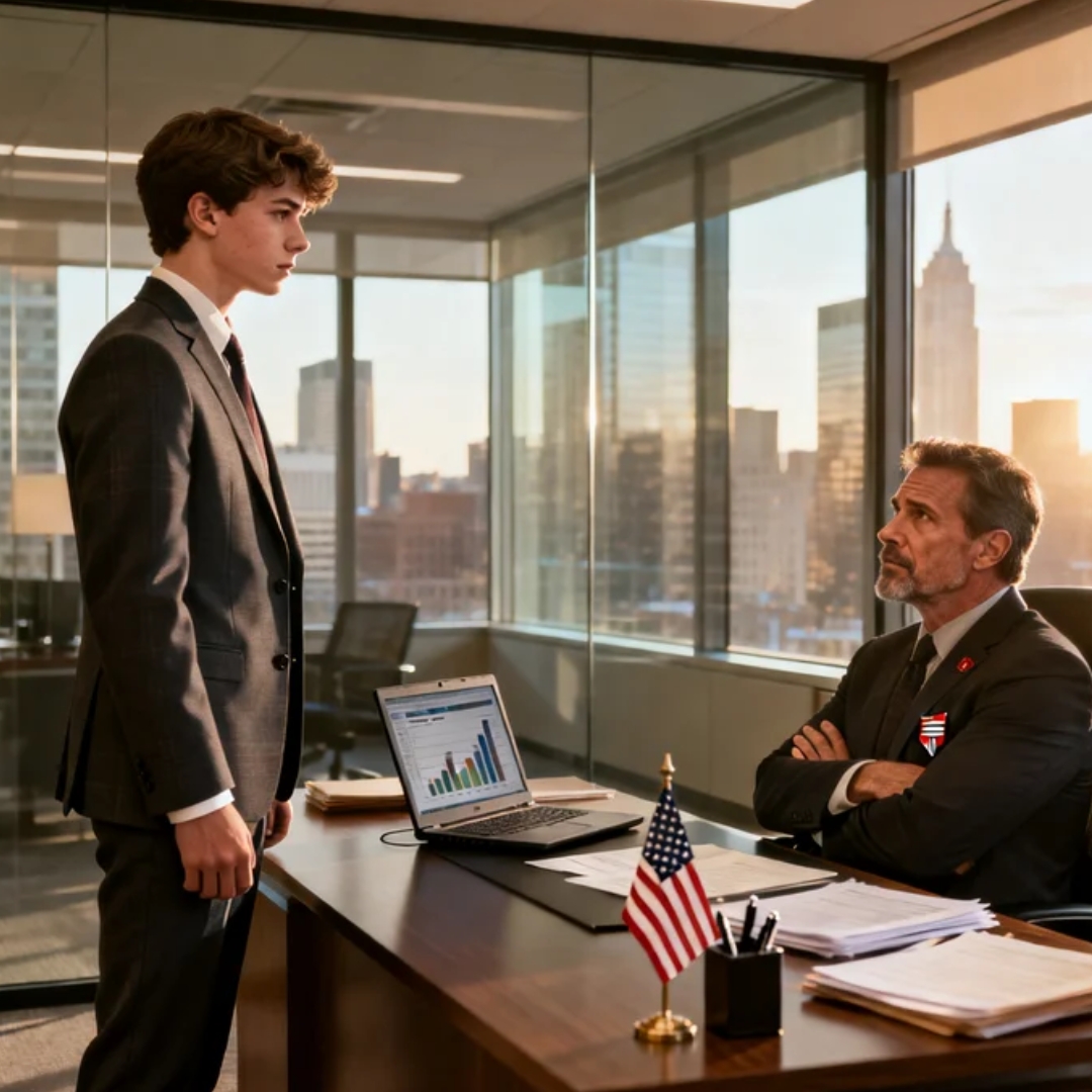 He was nineteen but dressed like he’d already picked out his own portrait for the lobby. Expensive suit, bright white shirt, shoes that probably cost more than my first car. His hair was styled with that careful messiness that took effort. Everything about him was polished—except his eyes.