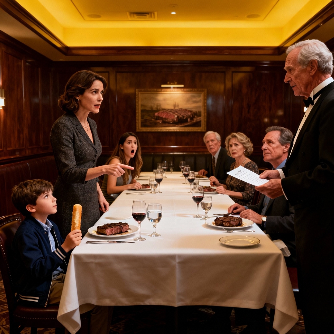 Their kids—my nephews—were already halfway through hundred-dollar steaks, cutting them badly with too-big knives, sauce smeared on the white linen, laughing with mouths open. Ethan stared at the bread basket like it might bite him back if he reached for it.