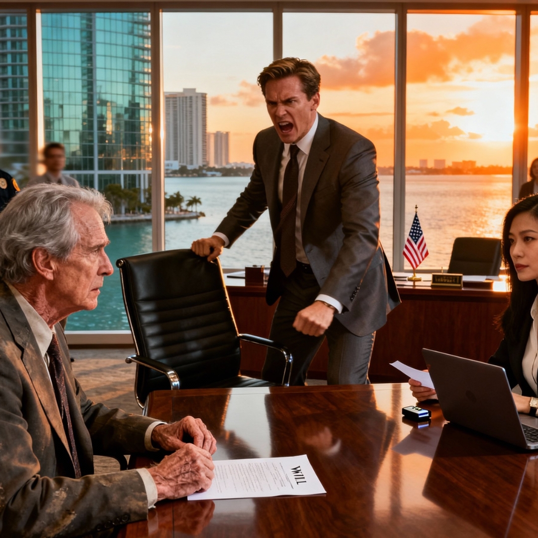 The conference room had floor-to-ceiling windows overlooking Biscayne Bay. Dark wood table. Leather chairs. And there, leaning back like the world owed him comfort, was my son.